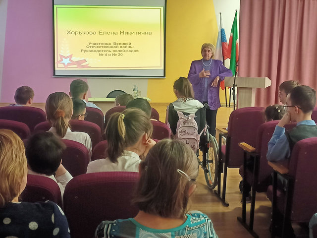 Людмила Николаевна рассказала учащимся и сотрудникам о жизни своей коллеге и наставнице, ветеране ВОВ Хорьковой Елене Никитичне.