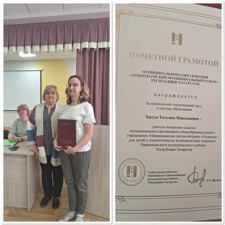 Опубликовано: 02.06.2024За многолетний плодотворный труд в системе образования наш педагог, Хитун Татьяна Николаевна - учитель начальных классов, награждена Почётной грамотой главы муниципального образования "Нижнекамский муниципальный район".