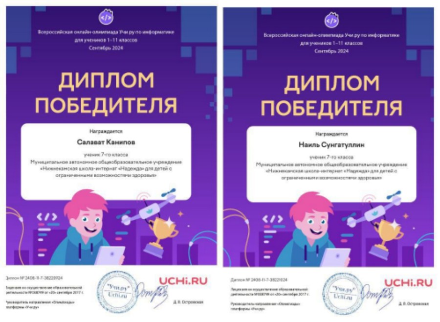 Опубликовано: 16.10.2024Поздравляем победителей олимпиады по информатике, которая проходила на образовательной платформе Учи. ру, Сунгатуллина Наиля и Канипова Салавата. На выполнение восьми заданий, которые охватывали ключевые аспекты предмета, отводилось 60 мин. Среди учащихся 7-12 классов нашей школы в олимпиаде участвовало 18 человек. Все они награждены похвальными листами и сертификатами участников. Так держать!