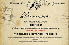 Поздравляем педагога дополнительного образования Маркелову Н. И. и её воспитанников за победу в X Всероссийском конкурсе "Гордость страны"