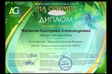 Поздравляем воспитанницу объединения "Рукодельница" Матвееву Екатерину и её педагога Маркелову Н. И. с замечательным результатом на Международном конкурсе-фестивале искусств "НА ОЛИМПЕ" - Лауреат 2 степени! Так держать!