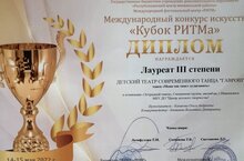 Поздравляем Казакову Ольгу Андреевну и её воспитанников театра современного танца "Гаврош" с отличным результатом на Международном конкурсе искусств "Кубок РИТМа" - Лауреат 3 степени!!!