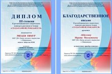 Подведены итоги II Республиканского творческого конкурса рисунков и чтецов "Солдатами не рождаются".Воспитанник театральной мастерской "СӘЛӘТ" Центра детского творчества - Ризаев Тимур был награждён Дипломом III степени в номинации "Конкурс чтецов" (младшая возрастная группа).Руководитель - Абдуллин Марат Махмутович был отмечен Благодарственным письмом за подготовку призёра конкурса.Поздравляем воспитанника и руководителя! Пусть в ваших глазах всегда горит энтузиам, и раскрываются новые возможности. Вперёд, к новым победам!