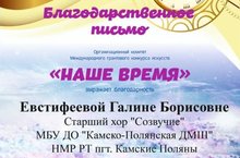 Старший хор "Созвучие" под руководством преподавателя Евстифеевой Г.Б. (концертмейстер Буканина В.Е.) приняли участие в Международном конкурсе искусств "Наше время" и стали лауреатами 1 степени. Примите наши поздравления!