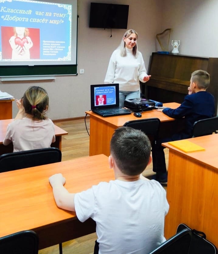Опубликовано: 15.11.2024Классный час "Доброта спасет мир" прошел в музыкальной школе 15 ноября. Дети с удовольствием делились своими впечатлениями от добрых дел, пусть добра будет больше в нашем мире!
