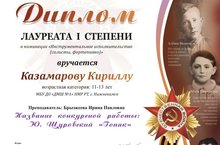 Поздравляем ученика фортепианного отдела ДМШ №1 Казамарова Кирилла с лауреатством I степени в Международном конкурсе, посвящённом Великой Отечественной войне, «Поклонимся великим тем годам!»!