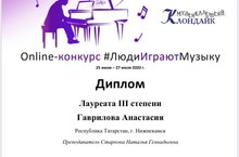 Поздравляем лауреата III степени Online-конкурса «#ЛюдиИграютМузыку» Гаврилову Анастасию!