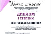 Поздравляем ученицу ДМШ №1 Красильникову Ксению с Дипломом I степени в I Международной олимпиаде по музыкально-теоретическим дисциплинам среди обучающихся 1-8 классов среди учащихся детских музыкальных школ и детских школ искусств «Teorico musicale»!