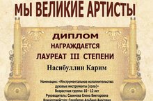 Поздравляем ученика оркестрового отдела ДМШ №1 Насибуллина Карима с лауреатством III степени в III Международном фестивале-конкурсе детского, юношеского и взрослого творчества «Мы великие артисты»!