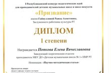 Поздравляем преподавателя теоретического отдела ДМШ №1 Попкову Елену Вячеславовну с дипломом I степени в I Республиканском конкурсе педагогических идей для преподавателей детских музыкальных школ и школ искусств «Призвание» имени Гайнуллиной Раисы Ахметовны!
