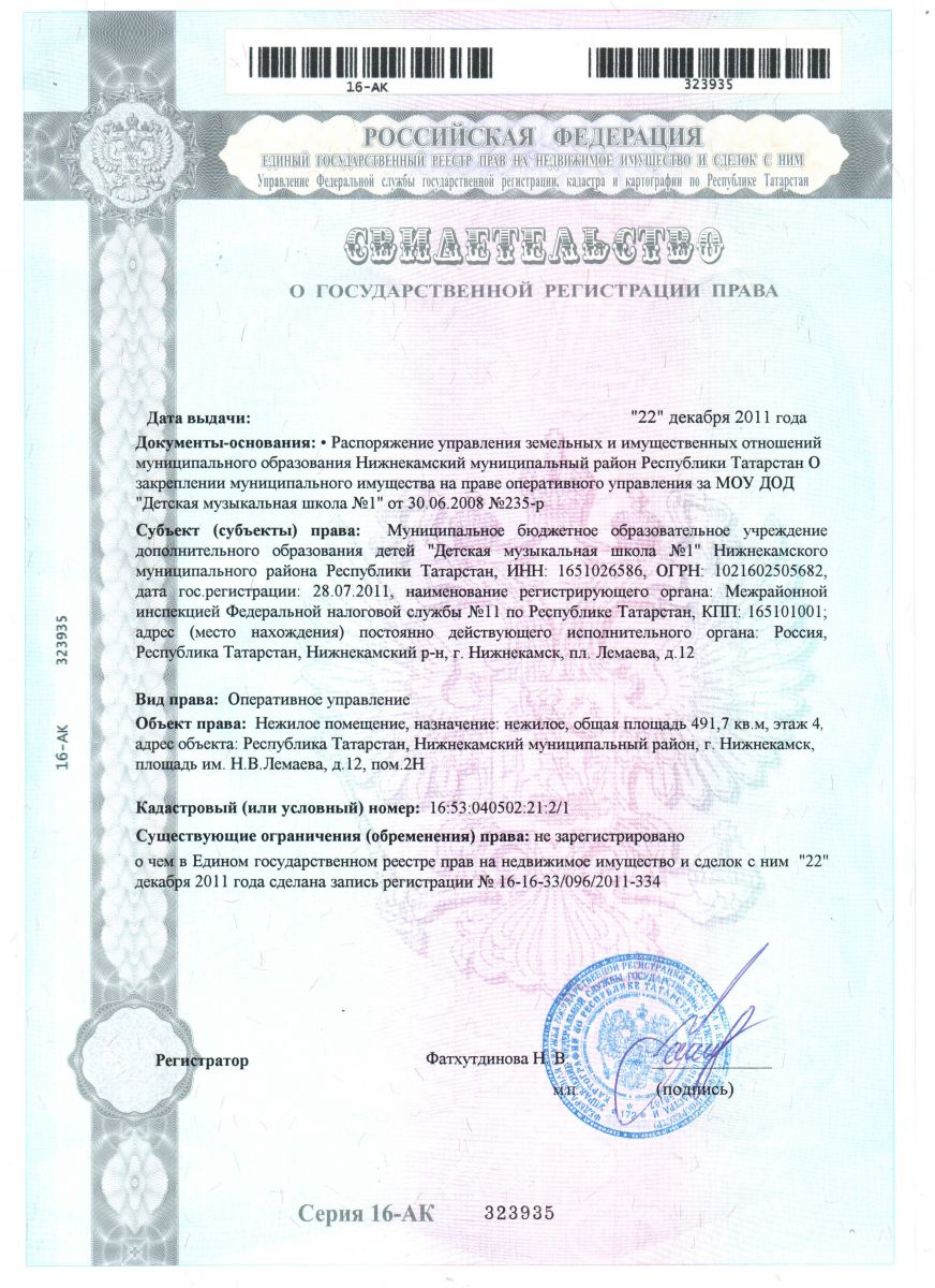 Муниципальное бюджетное учреждение дополнительного образования "Детская музыкальная школа № 1" Нижнекамского муниципального района Республики Татарстан