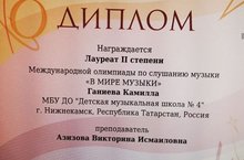 27 декабря 2019 года, учащаяся ДМШ № 4, Ганиева Камилла, приняла участие в Международной олимпиаде по слушанию музыки "В мире музыки" и стала Лауреатом II степени (преподаватель Азизова В.И.).