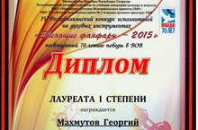 Поздравляем ученика 3 класса Махмутова Георгия, его преподавателя Газеева Эдуарда Марсовича и концертмейстера Мешкову Ольгу Викторовну с победой в IV Республиканском конкурсе исполнителей на духовых инструментах "Звенящие фанфары-2015" (в номинации "Духовые инструменты - труба"), посвященном 70-летию Победы, проходившем 15 мая 2015 года в г. Елабуга. Молодцы!!!