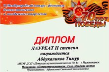 Поздравляем ученицу 3 класса Султанову Лиану, преподавателя Абдукаликову Юлию Александровну и концертмейстера Давыдову Елену Александровну со званием лауреата II степени в VI Международном конкурсе-фестивале детско-юношеского и молодежного творчества, посвященном 70-летию Победы, проходившем 1 мая 2015 года в г. Казани. Желаем дальнейших творческих успехов и побед!!!