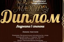 31 декабря, учащаяся оркестрового отдела "ДМШ №5" Ланцова Анастасия (кл.преп- ля Васильевой Н. Е) стала Лауреатом 1 степени в Международном конкурсе -фестивале "Маэстро".