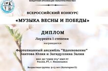 Фортепианный ансамбль "Вдохновение" в составе Заитовой Юлии и Загидуллиной Залии - Лауреат I степени (кл.преп-ля Нигматзяновой А.Н, Гуськовой Н.В);
