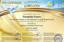 30 ноября, учащаяся вокального отдела "Детской музыкальной школы №5" - Закирова Элина (кл.преп-ля Вафиной А.Р) отлично выступила и стала Лауреатом III степени в Международном фестивале - конкурсе искусств "На Олимпе" г.Москва.