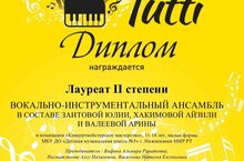 26 апреля, вокально- инструментальный ансамбль в составе Заитовой Юлии, Хакимовой Айзили и Валеевой Арины (руководители Нигматзянова А. Н, Вафина А. Р, Васильева Н. Е) отлично выступили и стали Лауреатами II степени во Всероссийском фестивале-конкурсе класического музыкального искусства "Tutti" г. Москва.