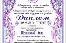 Сегодня в г.Москва состоялся Международный конкурс инструментального исполнительства «Музыкальный рассвет», в номинации Струнно-смычковые инструменты Шелонцева Анна стала Лауреатов 2 степени, преподаватель Рузанова К.В.