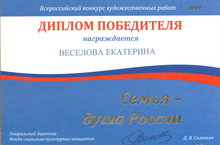 Учащаяся МАУ ДО «ДХШ №1» НМР РТ Веселова Екатерина (преподаватель Шевчук Лидия Николаевна) стала победителем Всероссийского конкурса художественных работ "Семья - душа России". Екатерина удостоена диплома победителя, а также ее работа опубликована во всероссийском сборнике работ «Семья – душа России». Поздравляем Екатерину с победой! 29.10.2019