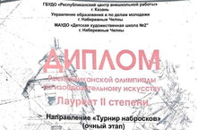 8 декабря восемь учащихся МАУ ДО "ДХШ №1" НМР РТ приняли участие в очном этапе Республиканской олимпиады в номинации «Турнир набросков», организованной ДХШ №2 г. Наб. Челны. В этот день удача была на стороне наших воспитанников. В категории 14-15 лет: диплом 2 степени у Галиевой Диляры (преп. Рудич В.Б.), диплом 3 степени у Гусаровой Екатерины (преп. Голованова М.В.) и Телицыной Анастасии (преп. Садыкова А.А.). В категории 16-17 лет: диплом 3 степени у Борисовой Евы (преп. Шевчук Л.Н.). Поздравляем с победой и желаем дальнейших творческих успехов! 10.12.2018
