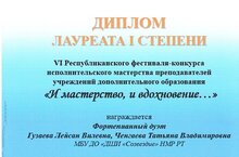 Призерами VI Республиканского конкурса "И мастерство, и вдохновение..." стали следующие педагогические ансамбли ДШИ "Созвездие": ансамбль народных инструментов "Карусель" (рук. Злобина Г.Р.) - Лауреат I степени, Фортепианный дуэт Гузаева Л.В. и Ченгаева Т.В - Лауреат I степени!