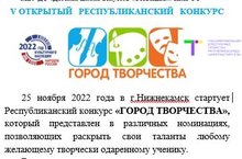 25 ноября 2022 года в г.Нижнекамск стартует V Открытый Республиканский конкурс «ГОРОД ТВОРЧЕСТВА», который представлен в различных номинациях, позволяющих раскрыть свои таланты любому желающему творчески одаренному ученику.