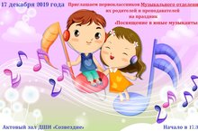 17 декабря в 17.30 приглашаем всех первоклассников Музыкального отделения школы , их родителей и преподавателей на праздник "Посвящение в музыканты", который пройдет в зале ДШИ "Созвездие".