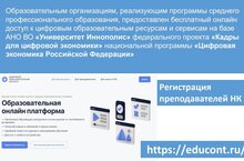 В рамках реализации федерального проекта «Кадры для цифровой экономики» национальной программы «Цифровая экономика Российской Федерации», преподавателям и студентам ГАПОУ «Нижнекамский агропромышленный колледж» предоставлен бесплатный онлайн-доступ к цифровым образовательным ресурсам и сервисам, созданным на базе АНО ВО «Университет Иннополис».