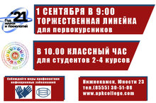 Торжественная линейка для первокурсников, посвящённая началу нового учебного года в ГАПОУ "Нижнекамский агропромышленный колледж" состоится 01 сентября 2021 года в 9.00 часов.
