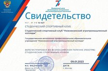 9 января 2023 года студенческий спортивный клуб «Нижнекамский агропромышленный колледж» прошел регистрацию во Всероссийском реестре (перечне) студенческих спортивных клубов профессиональных образовательных организаций и получил свидетельство о регистрации.