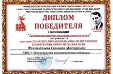 Поздравляем Файзылхакову Гульнару Масхутовну мастера производственного обучения Нижнекамского индустриального техникума с Победой на ХIII Республиканской научно-практической конференции имени Мусы Джалиля в номинации «Лучшая научно- исследовательская статья». Конференция проходила в ГАПОУ «Мензелинский педагогический колледж имени Мусы Джалиля».