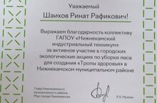 Коллектив Нижнекамского индустриального техникума отмечен Благодарственным письмом за активное участие в городских экологических акциях по уборке леса для создания "Тропы здоровья" в Нижнекамском муниципальном районе.