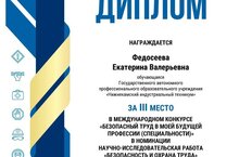 Международный конкурс "Безопасный труд в моей будущей профессии" в номинации научно- исследовательская работа "Безопасность и охрана труда" 26.04.2024