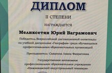 Студент Нижнекамского индустриального техникума Меликсетян Юрий является победителем (Диплом II степени) Всероссийской дистанционной олимпиады по учебной дисциплине "География" среди обучающихся профессиональных образовательных организаций. Преподаватель Сахапова Лиана Фавратовна. Поздравляем Юрия и желаем новых ПОБЕД!