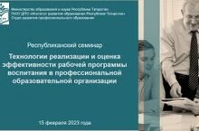15 февраля 2023 года отдел развития профессионального образования провел республиканский семинар «Технологии реализации и оценка эффективности рабочей программы воспитания в профессиональной образовательной организации» (в соответствии с государственным заданием, утвержденным приказом Министерства образования и науки Республики Татарстан от 30.12.2022 № под-2345/22).