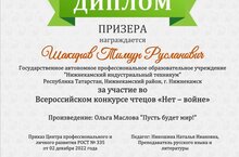 Шакиров Тимур — студент группы № 456 — стал призером Всероссийского конкурса чтецов «Нет войне!», который был проведен с целью формирования чувства патриотизма о обучающихся. Призера подготовила Никошина Наталья Ивановна — преподаватель русского языка и литературы.
