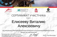 В Республиканском конкурсе социальных видеороликов "Фокус на честность" принял участие студент 1-го курса группы 443 Елисеев Виталий (педагог: Никошина Н.И.).