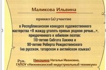 Студентка группы № 448 Маликова Ильвина приняла участие в Республиканском конкурсе художественного мастерства «Я жажду утолять привык родною речью…», приуроченного к юбилеям поэтов: 110-летию Сибгата Хакима и 90-летию Роберта Рождественского (на русском, татарском и английском языках), организованного ГАПОУ «Казанский энергетический колледж» (руководитель: Никошина Н.И.). На конкурс было представлено 107 творческих работ.