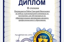 В декабре 2020 г. студент группы № 432 Рябов Григорий занял 2 место на Региональной олимпиаде по математике для обучающихся по образовательным программам СПО, ФГБОУ ВО «НГПУ» под руководством преподавателя математики Газизовой З.У.