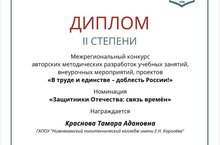 Преподаватель Краснова Тамара Адановна одержала победу, заняв почетное второе место на престижном Межрегиональном конкурсе авторских методических разработок учебных занятий, внеурочных мероприятий и проектов под названием «В труде и единстве – доблесть России!»