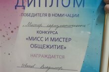 Иванов Владимир студент группы 122 стал победителем в номинации "Мистер харизматичность" в муниципальном конкурсе "Мисс и Мистер общежитие".