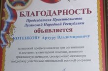 БЛАГОДАРНОСТЬ председателя Правительства Луганской Народной Республики Е.В.Ковальчук объявлена нашему выпускнику Политехнического колледжа имени Е.Н.Королёва Котенкову Артуру и его папе воину-интернационалисту, участнику общественной организации Боевое братство Котенкову Владимиру , поисковикам, людям, которые делают Благое дело - " Всё для фронта, всё для Победы".