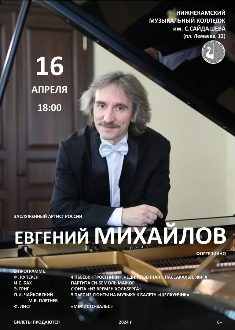 16 апреля, в концертном зале Нижнекамского музыкального колледжа выступит заслуженный артист России, народный артист Республики Татарстан, профессор кафедры специального фортепиано Казанской консерватории имени Н. Г. Жиганова, концертирующий пианист - Евгений Михайлов!