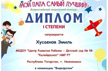 Поздравляем Хусаинова Эмиля, воспитанника подготовительной к школе группы #13 с победой в всероссийском конкурсе "Мой папа самый лучший" Диплом I степени.