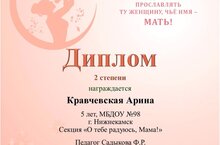 Поздравляем Крачевскую Арину, воспитанницу старшей группы №4, с победой в муниципальном конкурсе детского творчества "Мы будем вечно прославлять, ту женщину, чье имя - Мать!", посвященного Дню Матери. Куратор: Садыкова Флера Рафаэлевна, воспитатель.