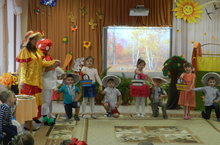 Продолжаются "Осенины" . Самые маленькие ребятки из группы "Топотушки" и старшие из групп "Почемучки" и "Аленький цветочек" побывали у Осени в гостях. Песни и танцы, красивые краски увядающей природы, игры и стихи - ребята очень старались порадовать Осень своими знаниями. Помогли диким животным, вспомнили о правилах поведения в лесу, помогли Боровику и Мухомору навести порядок. Показали Осени поделки из овощей, фруктов, природного и бросового материала. А щедрая осень угостила их свежими фруктами.