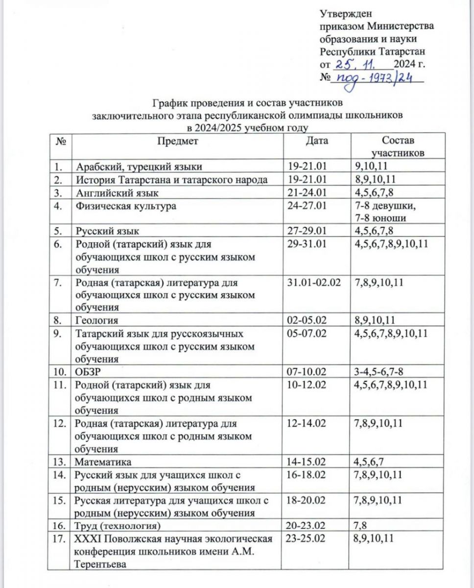 График проведения регионального этапа всероссийской и заключительного этапа республиканской олимпиады школьников на 2024-2025 учебный год
