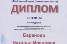 От всей души поздравляем Баранову Наталью Ивановну, педагога дополнительного образоваия Детского эколого - биологического центра, занявшую первое место в региональном этапе всероссийского конкурса педагогического мастерства "Мой лучший урок".