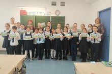 Школьники выполняли задания, которые предлагали им Знатоки переработки - пёс Рекс и Кубокот: